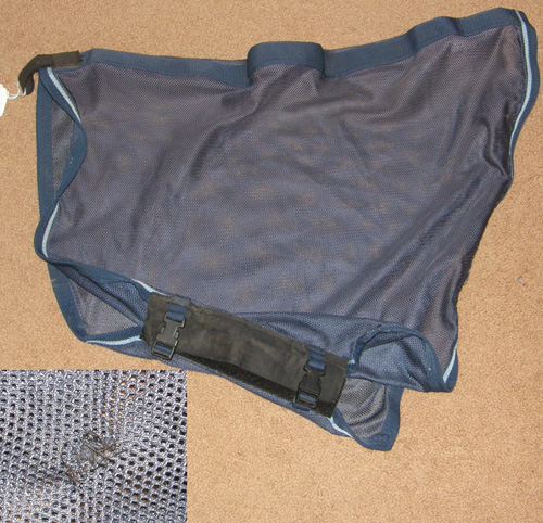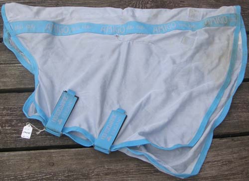 Light blue soft & stretchy mesh with blue binding. 2 wide velcro closure under the neck & 4 wide velcro tabs for attaching to fly sheet. Fits behind ears to the bottom of neck. Use as a neck fly cover or over a slinky/sleazy type hood to prevent rubs to lycra fabric. Great for covering wounds or bandages too. Measures 34 1/2" from poll to withers. Clean with a several repaired holes(see photos).