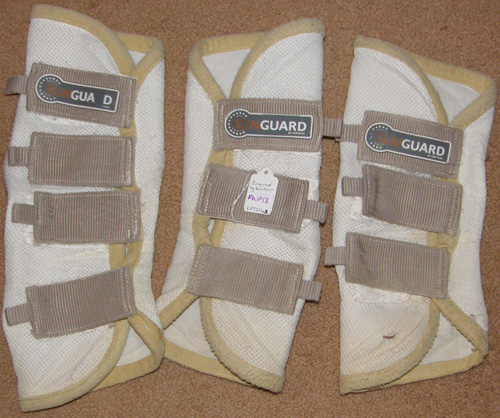 Mesh wraps offer strong & durable protection from sun, flys & other pests, & can be used over medicines as wound care protection. These wraps are made from a soft mesh with soft fleece edging to protect against rubs. Strong touch tape closure keeps leg wraps in place for turnout. Good used condition, clean, a few small holes but still very usuable. 16" tall(rear boots), 14"(front boots). Set of 3, 1 hind boot is missing, so use as spares, to cover an injury, etc.