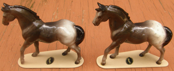 Vintage china horse figurine in grey blanket Appaloosa with dark hooves, black mane & tail, & black eyes. Glossy finish. This is a Specialty Figurine, meaning it was larger than the miniatures, and more attention was given to detail and painting. Sculpted by Maureen Love, approx 3 1/16” tall. Has original black & gold California state foil sticker on base. Believe this was released Fall 1998 to Fall 2000. Great vintage piece. No flaws or breaks were found & comes with original box. We have 4 of these models: #3 has a lot of grey shading in blanket almost obscuring the spots which are faint on left side & bolder on right side, also has price sticker remnants on bottom of base. #4 has larger irregular spots on butt, lighter colored legs & remnants of price sticker on bottom of base. Please specify which model you prefer.