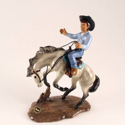 Vintage china horse figurine in grey with dark shaded legs, darker grey mane & tail, black eyes. Cowboy rider has black hat, blue jeans, blue shirt, brown boots. Horse has brown bridle & saddle, blue saddle blanket. Glossy finish. This is a Specialty Figurine, meaning it was larger than the miniatures, and more attention was given to detail and painting. Sculpted by Maureen Love, approx 5” tall. Has original black & gold California state foil sticker on base. Believe this was released Spring 1997 to 2006 & is the earliest variation of 6 shirt color & rider style variations. Great vintage piece. No flaws or breaks were found & comes with original box. Was only removed from box to have on display in our glass display case in the store, so remnants of price sticker on bottom of base & has #3233 written in pencil on bottom of base as well.
