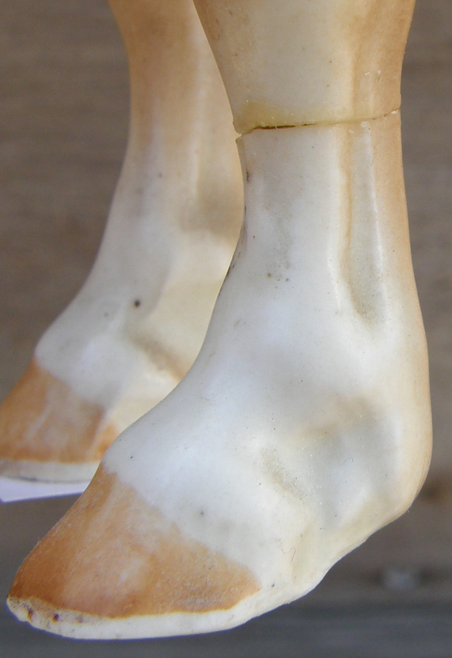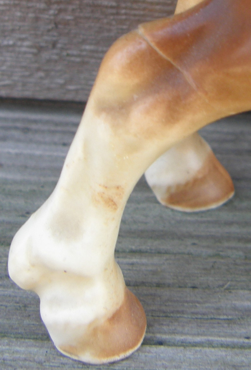 Vintage china horse figurine in light brown with white on all 4 legs, bobbed & ribboned tail, white blaze on face & tan hooves. Hand painted eyes. Matte finish. Repaired broken left front & right hind leg. 5” tall x 6” long. Has no sticker but has a number 1261 stamped on bottom of right front foot. Breather hole on belly between front legs. This has been in our personal collection since 1992. Great vintage piece.