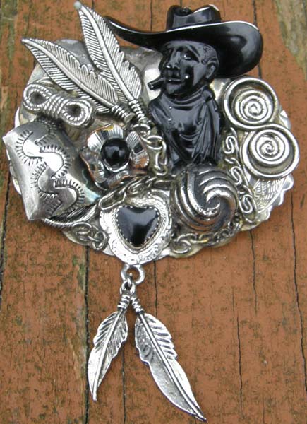 | Vintage Western Collage Brooch Cowgirl Cowboy Theme Pin Back Concho Costume JewelryThis is an interesting collage brooch that has a cowgirl or cowboy Western theme. The brooch has a black enamel cowboy in hat, feathers, a black enamel heart, coil of rope or lariat, twists of chain, swirling designs, etc. The brooch measures 2 1/4” wide x 2” high & has 2 feathers dangling from bottom. Foundation of brooch looks like a large concho. The brooch has J.B. & 1996 etched onto back & appears to be hand made from pieces of other jewelry. It is in excellent used condition with a rub to top right corner of cowboy hat, easily touched up with a dab of black paint.
