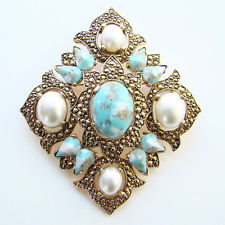This wonderful Sarah Coventry "Remembrance" pin back brooch pendant combined features a Etruscan like design set with faux turquoise art glass cabochons and faux pearls in a gold tone textured setting. Approx. measurements of the brooch are 2 7/8"  tall x 2 3/8" wide. There is a small hook at the top on the back for hanging on a necklace to make it a pendant. Stamped Sarah Cov on back & owner tells me this is a vintage piece from approx 1968. Excellent used condition only missing 1 small faux turquoise stone from the side from store handling.