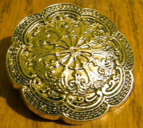 | Gold Concho Pin Back Brooch Costume JewelryGold tone plastic etched concho type pin back brooch. Great costume jewelry for wearing or craft projects. Measures approx 1 1/2” diameter. This does not look like it is plastic from the front! Possibly vintage, maker unknown, some glue marks on back.