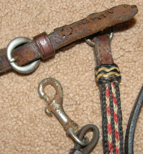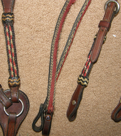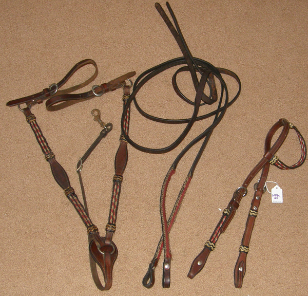 Vintage? Braided Horsehair Trim Sliding One Ear Western Headstall & Breast Collar Brown Leather California Braid Braided Rawhide Buttons Horsehair Trim Overlay Western Bridle Split Reins Center Ring Breastcollar Set