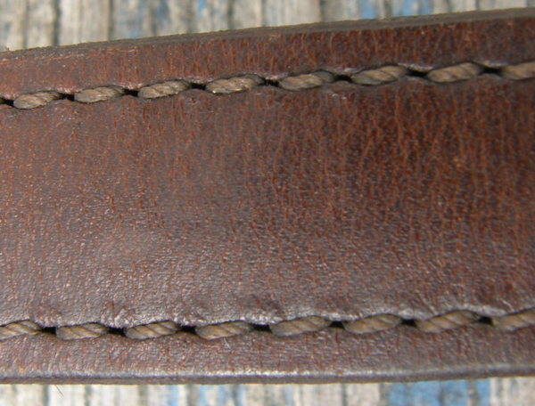 Shaped one ear style western bridle with doubled & stitched crown piece with white contrast stitching, single ply cheeks & throatlatch, & has Chicago screws at bit ends. Headstall adjusts on both sides & measures 42" at largest & 37 1/2" at smallest adjustment. It comes with 5/8" wide x almost 7' long matching split reins. Leather is supple & reins drape nicely in your hands, but some surface cracks at bit ends on headstall & end away from bit on reins. Still a great working or trail bridle. Brand unknown.