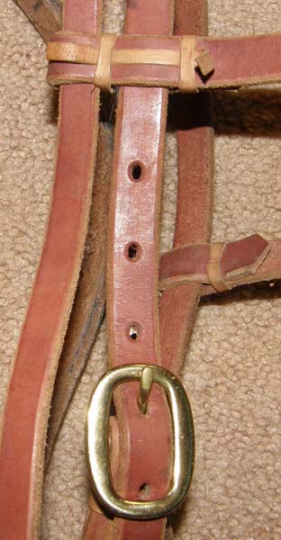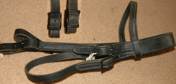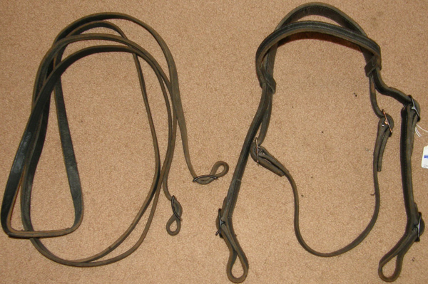 Reproduction military or cavalry style headstall in black heavy duty harness leather with adjustable black buckle ends, adjusts on 1 side of headstall only but throatlatch adjusts on both sides. No noseband or caveson. Measures approx 38" at smallest & 43" at largest adjustment, & 17" long browband. Crown is 1 5/8" wide. Comes with 3/4" wide 12 1/2' long matching 1 piece or gaming style rein with black conway buckle ends. Very heavy duty with thick doubled & stitched leather that is supple. Maker unknown. Owner used it for re-enactors but could be used by police horses.