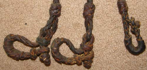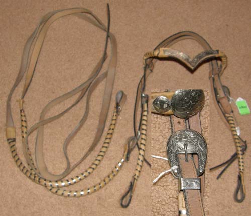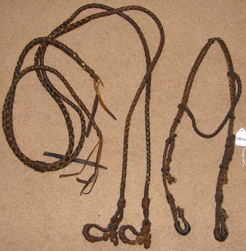 Round braided browband style western headstall with cheeks that adjust on both sides with button stops, braided buttons with sliding keepers at bit ends, reinforced where bit sits, & is a no throatlatch style. Looks like it is hand braided over a rope core. Crown & cheeks are made with 2 rows of 1/4" leather, & 3/8" round braided browband. Measures approx 42" as adjusted now in center adjustment with room to make smaller or larger. Comes with matching round braided split reins approx 3/8"-1/2" wide, slightly over 6' long, & has a sliding braided leather keeper. Some stretching has made reins different widths in many areas. Tail ends of reins are stiff & cracking. Maker & age unknown, truely a vintage piece as it came from elderly man who trained horses 40+ yrs ago. Some wear & stretching to leather in places, but should still be usable.
