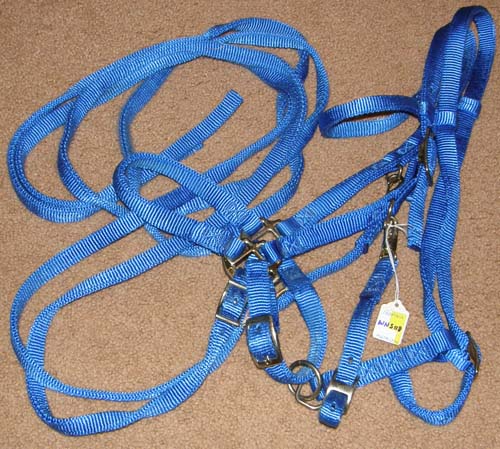 Blue nylon English or western trail bridle headstall halter with cheek pieces with snaps that can be removed so horse can be tied or graze without bit in their mouth & without having to remove your bridle. Great lightweight bridle for the endurance rider. Conway buckles at bit ends. This uses premium materials doubled & stitched, brass fittings, and is all American made. Features 3/4" halter with 5/8" headstall with 5/8" wide reins a little over 7’ long. The premium heavy duty nylon yields a soft & flexible feel instead of a stiff & abrasive one, the box & cross stitching at all stress points give you maximum comfort & fit while still retaining the break strength required for heavy duty use. Add some snaps to the reins for easy on/off. Very minor dirt inside from contact with horse otherwise excellent used condition.