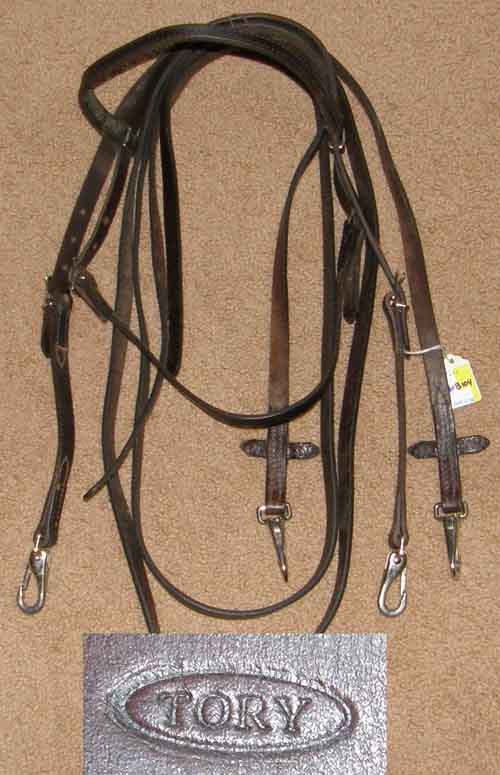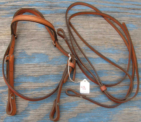 Browband style western headstall features cheeks & throatlatch that adjust on both sides, & nickel spring snaps at bit ends. Single ply leather with rubbed & darkened edges, & doubled & stitched browband. Comes with Tory single ply bridle leather western reins 5/8” wide x 7’ long with darkened edges, sewn in martingale stops & spring snaps at bit ends. Makes a great training set as it's easy to change bits, rein stops good for use with martingales or other training devices. Leather is soft, supple & good for training or pleasure.