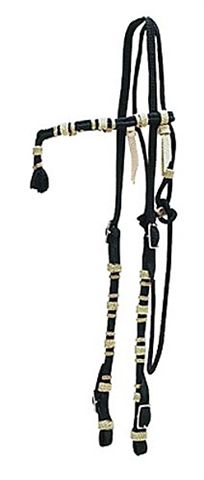 These quality constructed 1/2" braided nylon headstalls feature braided nylon overlays. Nickel plated hardware (including buckle bit ends). Feature contrasting tan accents. Knotted brow band style western headstall. Comes with matching gaming or roping reins 3/8” wide, 8' long with trigger or scissor snaps at both ends. Great as low maintenance trail or everyday working set. All ends are heat sealed to points so easy to thread through buckles. Very adjustable as there are not set holes, so should fit a wide variety of head sizes from Cob to Large Horse. New with tags, only sold as a set. Headstall tagged #8195 CJ, reins tagged #8135 CJ.