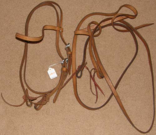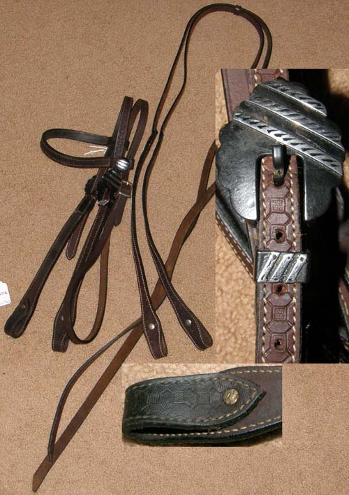 V browband style western headstall with darkened edges, rolled leather & silver laced on brow & cheeks, V shaped brow band with etched “silver” trim, bridle rosettes, "silver" buckles, tips, keepers, & conchos at bit ends. Headstall adjusts on both sides. This comes with 6’ matching split reins that are rolled & silver laced leather for 1st 18”, then flat leather for rest of reins. Note: the cheeks on this twist, i.e. don’t lie flat with bit concho facing outward. This should not be a problem when a bit is used, but is noticeable when lying flat. Leather is soft, but silver is the cheaper stuff. Minor stains from use on reins & light creases from reins being tied. Brand unknown but probably imported.