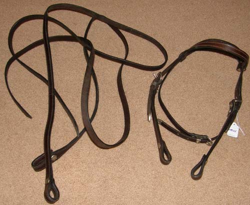 Browband style western headstall with white contrast stitching, Chicago screws at bit ends & comes with matching almost 7’ long split reins. Headstall adjusts on both sides & both reins & headstall are scalloped or shaped at the bit end. Excellent used condition with minor staining to leather in places. Brand unknown.