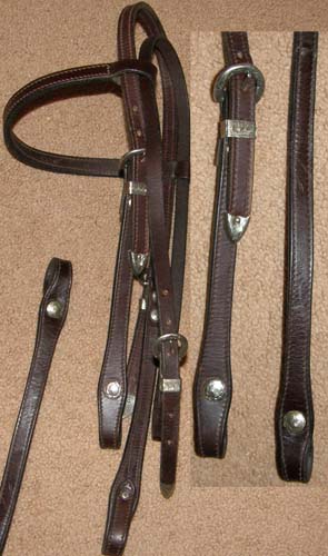 Doubled & stitched browband style western bridle with etched “silver” buckles, keepers & tips & has conchos at bit ends. All buckles are removeable with Chicago screws. Comes with matching 6 1/2’ plain split reins with etched “silver” conchos at bit end. Headstall adjusts on both sides & measures 43" at largest adjustment & 38" at smallest with 4 factory punched holes on each side. Brand unknown but similar in quality to Showman brand.