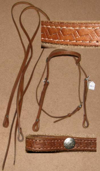 Doubled & stitched 5/8" wide basketweave stamped sliding one ear style western headstall with white contrast stitching, braided rawhide trim on cheeks & ear piece, & quick change metal loop/strap at bit ends. Headstall adjusts on both sides with etched "silver" buckles & measures 44” at the largest adjustment & 38" at smallest with 5 factory punched holes on each side. Comes with matching 5/8” wide x 6' long split reins with matching braided rawhide trim & Chicago screws at bit ends. A few ends of braided rawhide stick out on headstall but don't seem to be unraveling, & leather is sturdy yet supple. Brand unknown, similar to Cody, Hilason, Showman, etc.