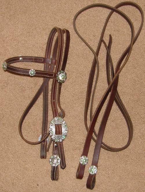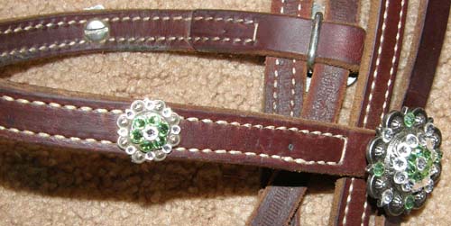 Soft quality Weaver leather browband style western bridle with white contrast stitching, adjustable on one side with several holes, & comes with almost 5’ split reins. This is a converted bridle, but is Pony size. Fancy green & clear crystal studded silver berry concho bridle rosettes added, matching conchos added to browband, stitched in buckle removed & fancy green crystal studded huge silver buckle added with Chicago screws, leather string ties removed from both bridle/reins & fancy matching berry conchos with horseshoe center(bridle only) added. Well done conversion of plain bridle to show bridle! Headstall measures 34 1/2" largest & 29 1/2" smallest with 6 factory punched holes. Use for showing, rodeo, gaming, etc. Conchos & buckles alone worth the price!