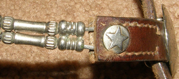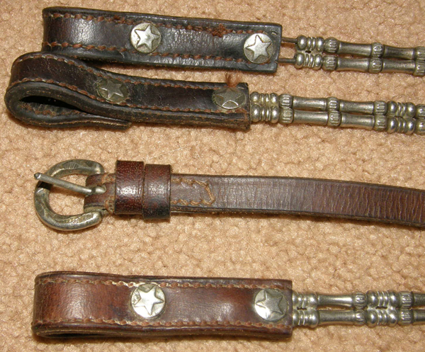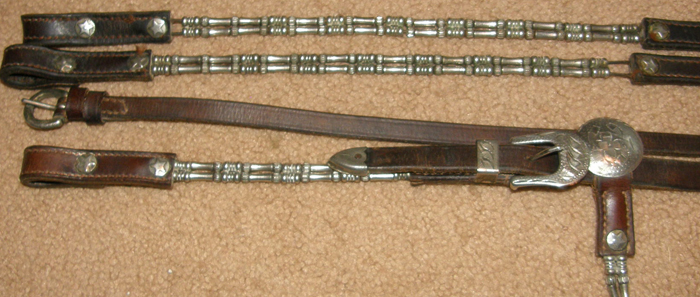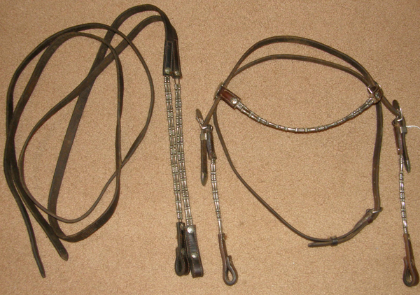 Western show headstall with 5/8" leather, browband style with double row of etched silver ferrule beads on brow & cheeks, engraved "silver" buckles, keepers, & tips, etched "silver" bridle rosettes. & fancy Chicago screws at bit ends. Measures approx 45” at largest adjustment & 39" at smallest. Split reins have matching double rows of beads for 1st 11" & measure 5/8" x 6 1/2' with scored edges. Because of the doubled row of ferrule beads, they act like weighted reins to encourage the horse to lower its head. Brand unknown, probably imported, but an interesting looking bridle that would look great on your horses head. Reins have some scuffs, but overall leather is supple.