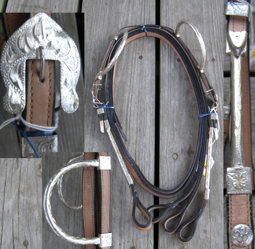 Rolled Silver Sliding Double Ear Western Show Bridle Lt Oil Western Show Headstall Rolled Silver Cheeks Matching Split Reins Silver Tube Ears & Cheeks Horse