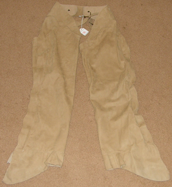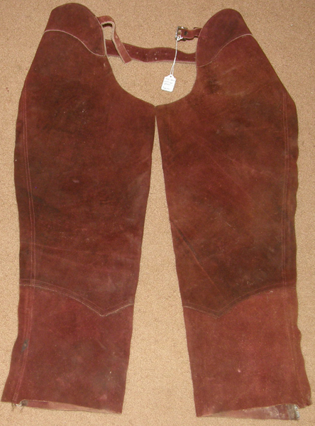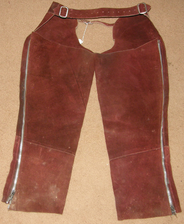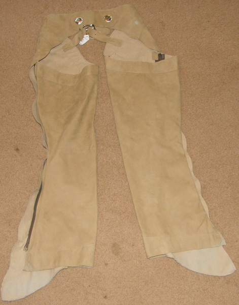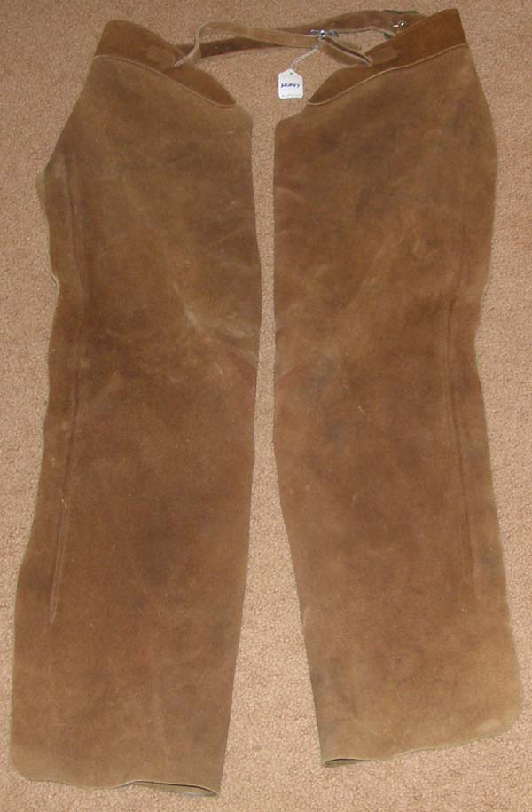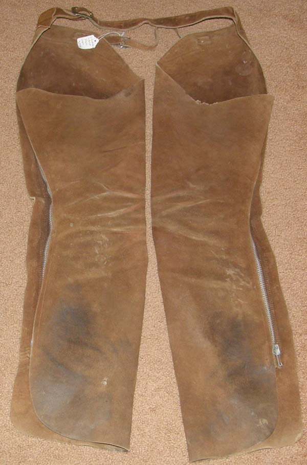 Western no fringe chaps or English schooling chaps with adjustable back strap with buckle adjustable front, has heavy duty YKK zipper & straight cut legs. It flat measures 25” Thigh, 21" Mid Thigh, 18 1/2" Knee, 18” Calf, 28 1/2" Outseam(zipper from top to bottom), 27 1/2" Inseam, 36” long from hip to hem. Waist is very adjustable as back strap has 15 holes & buckle adjusts both sides & front strap has 4 holes, with largest adjustment measuring almost 40". These chaps are stiff, thick suede but should break in with use. Lots of spots & stains, & zippers work but are stiff. Make great work, trail or schooling chaps. Brand unknown.