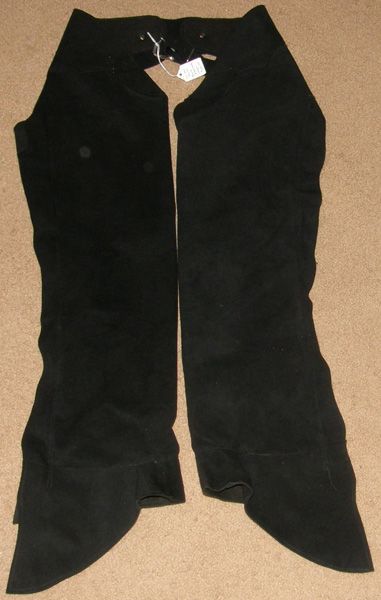 Western or English schooling chaps with adjustable back strap, no fringe. Not tagged as to brand, but is tagged Made in USA, size XL, it measures 28” Thigh, 19“ Knee, 15” Calf, 30 1/2“ Outseam(zipper from top to bottom), 31“ Inseam, 39 1/2” long from hip. These chaps are very soft & flexible, not stiff, thick suede. There is a small rip/hole on outside of right thigh near zipper(see photo), but it is on the piece that covers the zipper, not in chap itself. Dirt/wear mainly to lower part of legs. Zippers work well. Make great work, trail or schooling chaps.