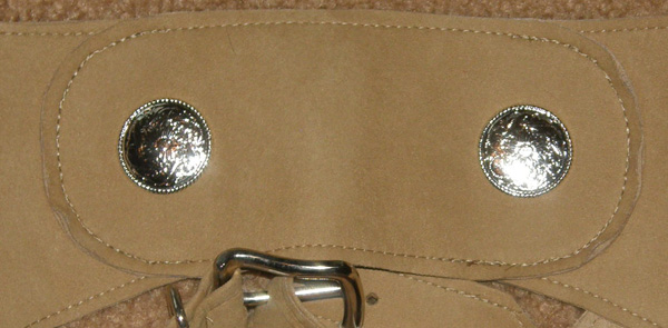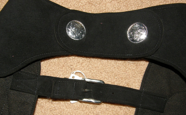 Soft UltraSuede western show chaps with no fringe scalloped edge & comes with front buckle/keeper & 2 etched "silver" 1 1/4" diameter conchos in back. Ultrasuede is lighter & cooler than leather, is more colorfast, & dry cleans or washes beautifully, but is not as durable as leather. Features yolk trim, reinforced at top of thigh & trim at bottom of leg. Custom made so no tags, it measures 30” at waist at center hole with 2 holes on either side, 18 1/2" Upper Thigh, 16 1/2" Mid Thigh, 14" Knee, 14 1/2" Calf, 22" Outseam(top to bottom of zipper on outside), 23 1/4" Inseam, 35 1/2” Hip to very bottom of drape. Zippers work well! Excellent hardly used condition with light on mainly inside of bottom trim.