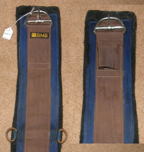 4 3/4” wide blue nylon western cinch with brown nylon overlay, lined in 1” thick black hospital felt, total width almost 6”. Overall length is 34”. Has billet keeper on off side & 2 small D-rings, small D’s are rusty, large connector D’s are not. Some hair in felt, but otherwise great used condition.
