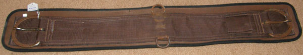 Air-Flow waffle weave patterned durable PVC neoprene back with strong nylon web top with quick-grip attachment for easy removal to be washed or replaced. Waffle-patterned neoprene prevents slipping, doesn’t require excessive tightening. Heavy flat steel hardware. D rings in center for equipment attachment. Washes easily and helps prevent the spread of fungus. Easy to clean, just peel neoprene from webbing & buckles to wash separately. A easy to care for cinch that will be great for schooling, training, trail riding and all other daily western activities. This was tagged 33 before we washed it, now tag unreadable but measures 32" from buckle to buckle. Rust on buckles & D's. Buckles still move freely, but center D rings are frozen in place, & may work loose with use. Just cleaned, still some sweat marks & minor hair on underside.