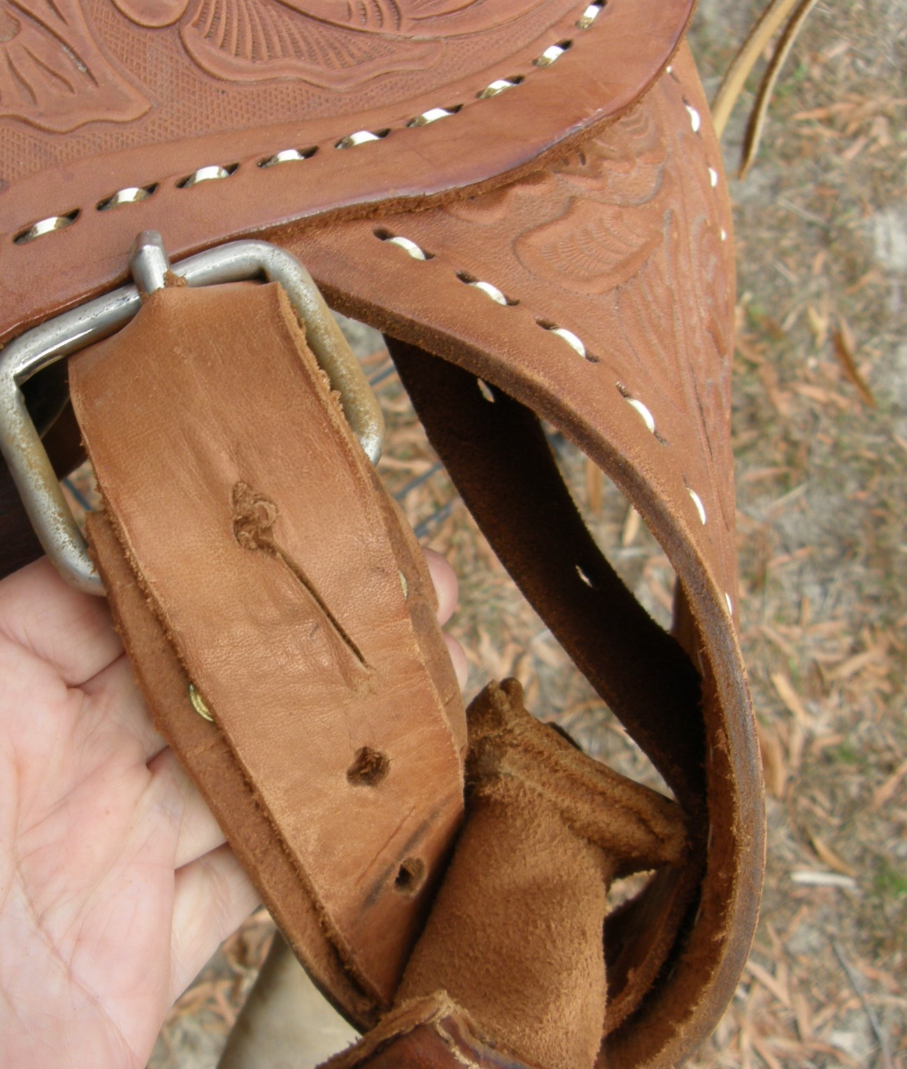 Lightweight tooled leather childs western saddle, small enough for ponies or large minis, & yet still usable on full sized horses. Suede lined leather covered western stirrups with 4" tread, white buckstitching, rounded back, tooled skirts & fenders, very adjustable stirrup leathers with buckle, fancy stitched suede padded seat, white fleece bottom, leather string ties, & leather off billet & tie strap that take western style girth. Brand unknown. Excellent used condition with a few spots of discoloration on seat & pommel & a few holes were added to stirrup adjustment strap. There is a tear between the smallest/last 2 holes on 1 strap(see photo).