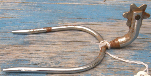Slip on style Western spurs with 1” neck that drops down 1" for an extreme swan neck & has 6 point rowels. 2 1/4" opening & 3 1/4" deep. Need to be used on a boot with a heel. Brand unknown. A few spots of rust & rowels spin freely. Single spur only. Use to replace lost spur, for decorating, etc.