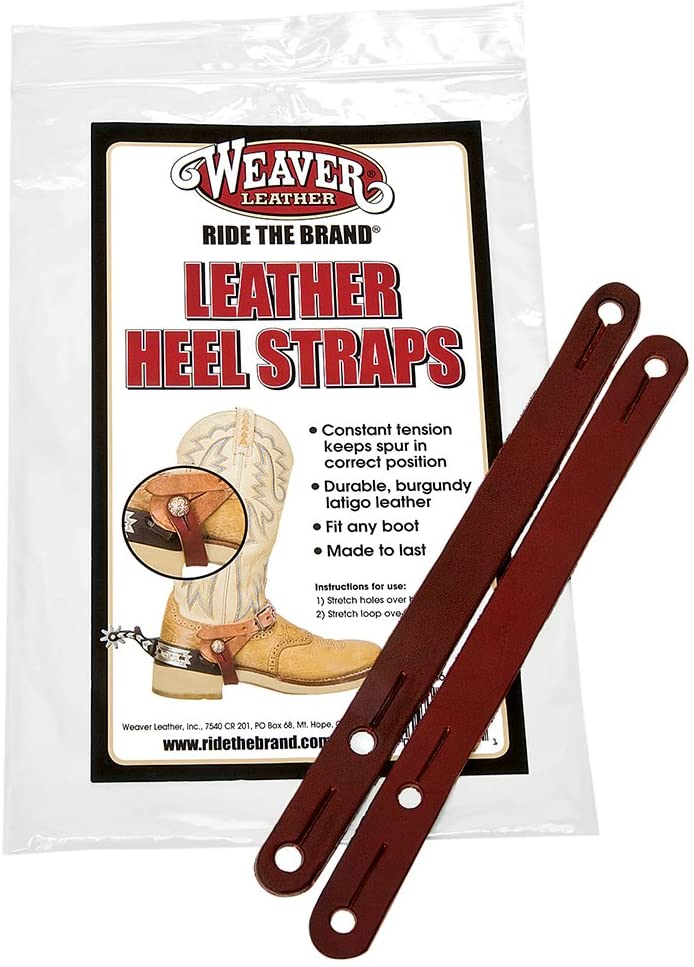 Constructed from burgundy latigo leather, these heel straps help maintain constant tension to keep spurs in the correct position. Made to last, these 8" heel straps will fit any boot. Simply stretch the holes over the buttons. Keep your spurs in place while riding! Great for trainers, showers & riders alike. Comes in pairs.