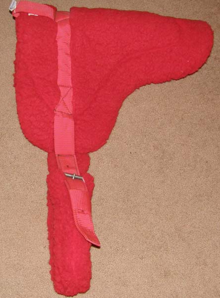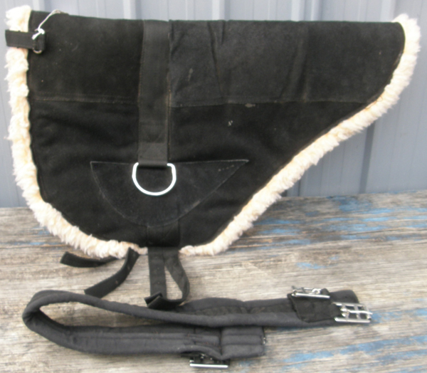 Suede leather bareback pad lined with thick maize colored fleece padding with nylon hand hold or grab strap. It has nylon billets(2 on each side) & D rings if you want to add stirrups. Pad measures approx 26” at spine & 33” wide when laid out flat. It can be used with any style English girth but comes with black 34" girth. Please note- Bareback pads will slip! Bareback pads are not a substitute for a saddle or designed to be used for mounting the horse. Very minor dirt on underside & girth has been cleaned with only minor hairs left.