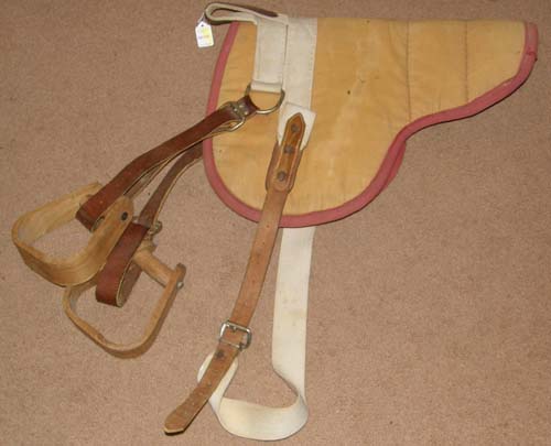 Vintage style bareback pad with cotton duck canvas like fabric top, felt center & bottom, cotton web & leather cinch, leather trimmed cotton web hand grip/grab strap, & adjustable leather stirrup straps with roller buckles with western style wooden stirrups. Bareback pads are great because they are lightweight and bring you closer to your horse, but do require an experienced rider. 21 1/2" long front to back. Good used condition, a few spot spots & a fray to top, minor surface cracking to leather girth strap when tightly bent, & minor rust spots on hardware.