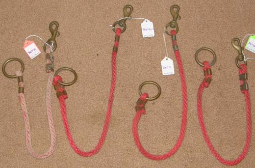 Attach your feed/water buckets to the wall, fence post, rail, tree or trailer with this rope bucket hanger. Made out of 3/8" braided poly rope approx 2' long with brass ring & snap, this attaches securely to tree, post, fence or trailer loop by running the rope around post, rail or trailer ring & dropping snap end through the ring. Great for stalls or pens, when on the road, or at shows, & can be used for a variety of livestock. Some rust on clamps, otherwise good used condition.