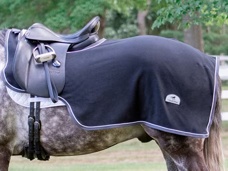 There is simply no better fabric for an exercise rug than the Polar Tec in the Saratoga Horseworks PolarTec 200 Exercise Rug! Polar Tec works wonderfully as an exercise rug. It is lighter in physical weight than traditional wool, and has the added benefit of stretch, making it easier on a horse's coat. It allows better freedom of movement and thus has less affect on a horses gait during training. PolarTec is more durable, lighter, warmer, much better wicking, and more economical than wool. Nothing on the market dries off faster! This exercise rug features a tail cord & loops for the girth and billet straps. Exercise rugs are under the saddle (just like a saddle pad) to keep your horses hindquarters warm. They are not intended to be removed during a training session. If you would like to be able to remove the rug once your horse has warmed up, try QHS2 or QHS3. Measures approx. 56”L x 60”W & is rounded on back corners. Great for cold weather riding!