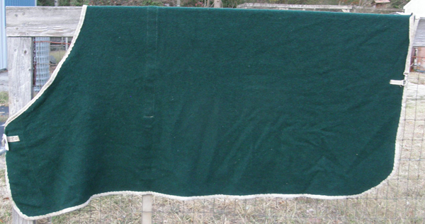 Wool or wool blend quarter sheet with girth keeper slot on each side & is meant to be worn under the saddle. Tagged size Regular, it measures approx 44" long, has tail cord & is rounded on back corners. Great for cold weather riding as keeps horses hind quarters warm. Your horse will look sharp in the sheet. Clean, still has some white hairs scattered throughout otherwise excellent used condtion.