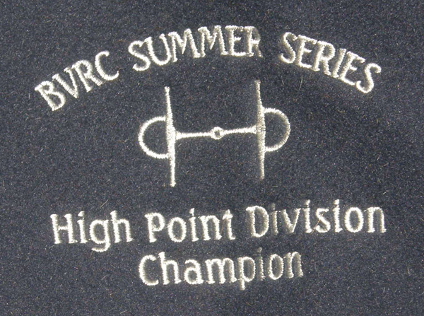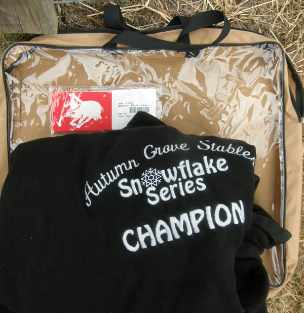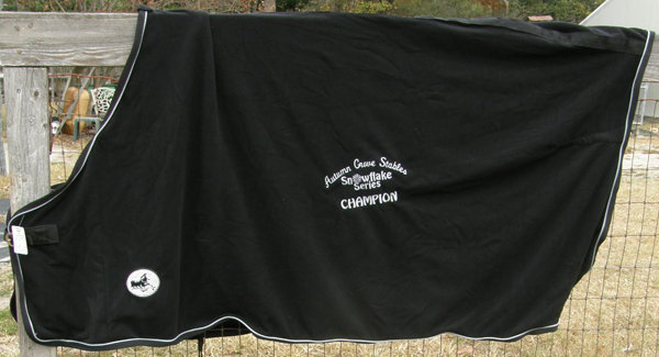100% poyester polar fleece quarter sheet, type designed as a wrap around to use under the saddle or over the rider's legs, & has touch tape at the wither. Tagged One Size, it measures approx 62\rdblquote L at spine with 30" drop & is rounded on back corners, padded at tail head & has tail strap. Great for cold weather riding as keeps horses hind quarters(and/or riders legs) warm. Clean, still has some small hairs, & tail cord was ripped & repaired. It was an award cooler so has BVRC Summer Series High Point Division Champion with a full cheek snaffle bit, all embroidered in silver on left back corner.