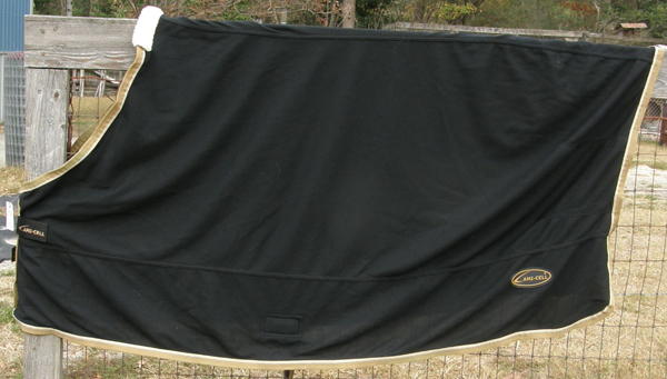 100% acrylic cooler tagged 84” x 90”. Black with red binding. This is the kind you use blanket clamps with as it has no front ties or tail cord. Great for bathing or cooling out horse after workout. Wicks moisture away from body. Recently laundered so may have shrunk, & has lots of "fuzzies" from washing but no holes that we can see.