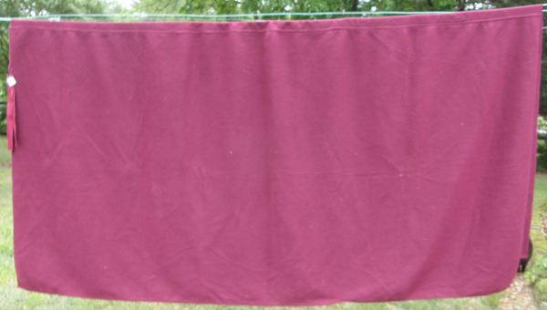100% acrylic cooler tagged 84” x 90”. Red with white binding. This has forehead strap & tail strap but front ties have been cut off so you would need to use blanket clamps. Great for bathing or cooling out horse after workout. Wicks moisture away from body. Clean so may have shrunk, & has lots of "fuzzies" from washing but no holes that we can see, only a few small repaired ones to a back corner. This was an award cooler so has embroidered on 1 side Onondaga Harness Horsemen Assn 1996 Fair Trotter of the Year.