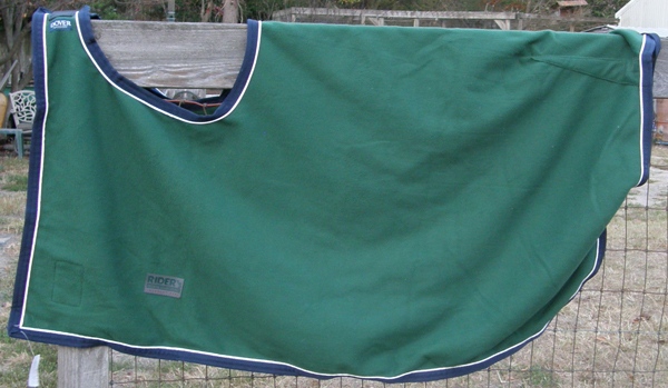 Soft fleece cooler that measures 92x92 with a seam down back. Brand unknown. Must have been someones 1st day on the job as they sewed the front ties in area of the horses forehead so we removed. We can include them if you would like to sew them on in an area that is appropriate, or just use blanket clamps/clips.