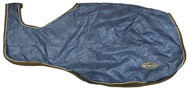 Measures 84” x 90”. Dark Navy Blue with White binding. Has forehead strap & front ties. Great for bathing or cooling out horse after workout. Wicks moisture away from body.