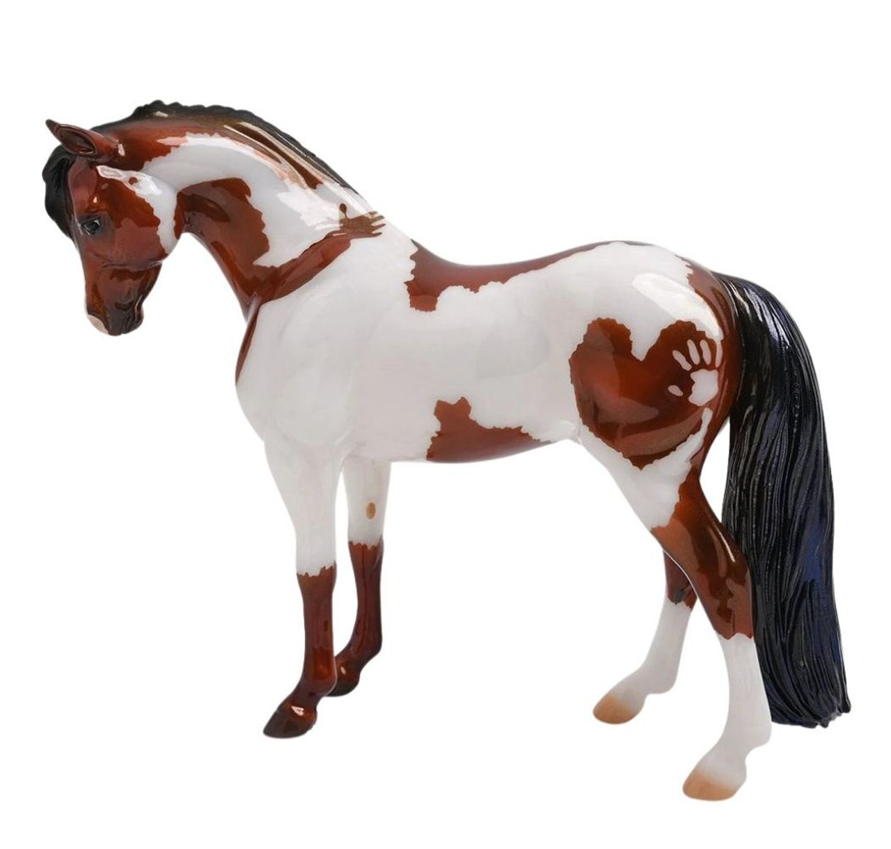 Chestnut pinto done on the Black Beauty mold. Made by Breyer in 1998 only & was released in a box with blue/white plank jump. Made only 1 year it is a hard to find model. This is just the horse, no jump nor box included. Horse has light rubs to both sides of body & eartips.