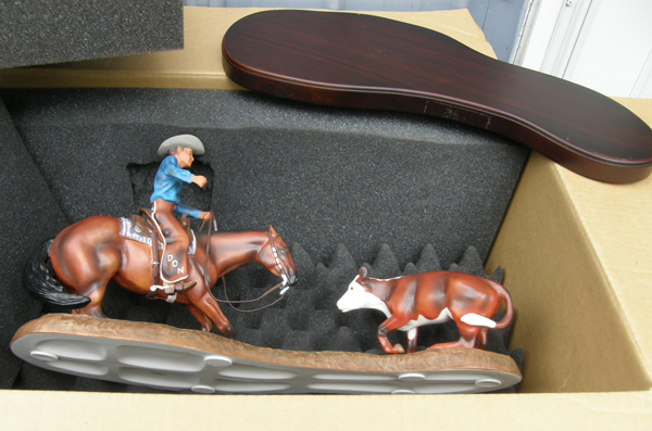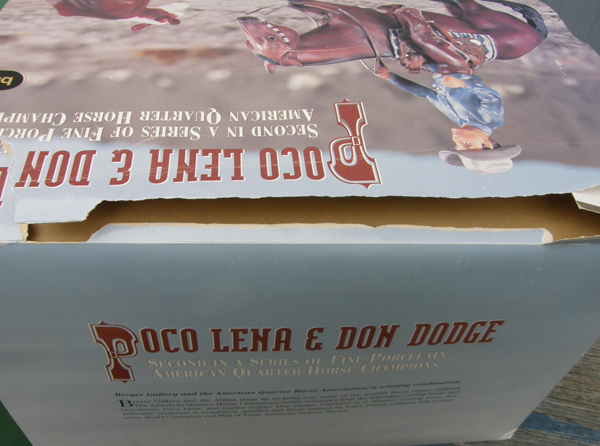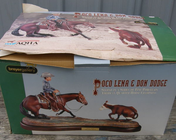 With meticulous attention to detail & crafted in fine porcelain, hand painted & fired, this piece makes a lovely addition to any room. Comes with a hardwood base & certificate of authenticity. Portrait model of famous Quarter Horse cutting horse champion Poco Lena & his rider Don Dodge cutting a steer. Comes fully detailed with molded on tack & rider. 2nd in the series. This has been removed from box to display & is still in mint condition. Comes with original box with very thick "egg crate foam", box top is ripped & box shows wear. Brass name plate is missing from base. 16" L x 8 1/2" H. Made by Breyer 2000-2002 only. We will only ship this box with INSURANCE. It is heavy due to porcelain & extra packaging.