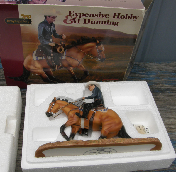 With meticulous attention to detail & crafted in fine porcelain, hand painted & fired, this piece makes a lovely addition to any room. Comes with a hardwood base, brass plaque & certificate of authenticity. Portrait model of famous reining horse Expensive Hobby & his rider Al Dunning doing a sliding stop. Comes fully detailed with molded on tack & rider. 3rd in the series. 10.5"L x 8.75"H. Made by Breyer 2000-2002 only. Comes new in box lined with styrofoam, but we will only ship this box with INSURANCE. It is heavy due to porcelain & extra packaging.