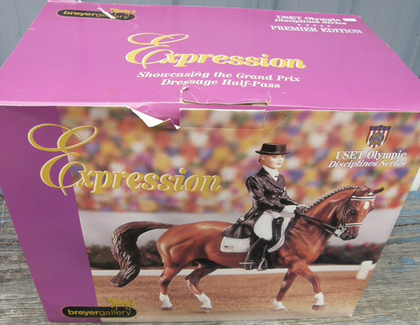 Expression, 1st in the series of Breyer Gallery/USET Olympic Disciplines, captures the grace of the Grand Prix half pass. Crafted in fine porcelain, hand painted and fired, this piece makes a lovely addition to any room. A hardwood base, brass plaque and certificate of authenticity complete this beautiful presentation. Comes fully detailed with molded on tack & rider. Made by Breyer 1999-2001 only as a Limited Edition of 2,500 pieces made. Very rare & hard to find. Comes new in box lined with styrofoam, but we will only ship this box with INSURANCE. It is heavy due to porcelain & extra packaging. NOTE: The box has a rip on top & shows wear so this was opened to verify condition but it is new in the box.