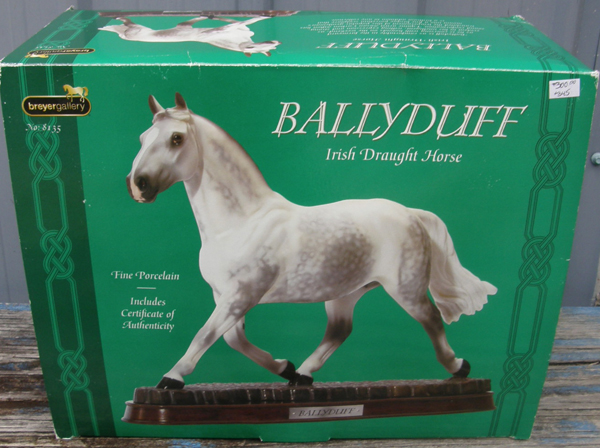 Dappled grey Irish Draught Horse on porcelain cobblestone base. Made by Breyer 2004-2005 only. Comes new in original styrofoam lined box with walnut wood base that has brass name plate & certificate of authenticity. Box shows some wear. We opened this to confirm condition & it has a tiny cluster of black dots on left chest that look like paint overspray from factory. We got 2 to come off but not the rest. We will only ship this box with INSURANCE. It is heavy due to porcelain & extra packaging.