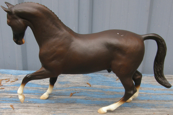 Dark chestnut done on the Roemer mold as a portrait model of real Dutch Warmblood famous dressage stallion of the same name that stood at stud at Iron Spring Farm. Made by Breyer in 1990-1993 only.