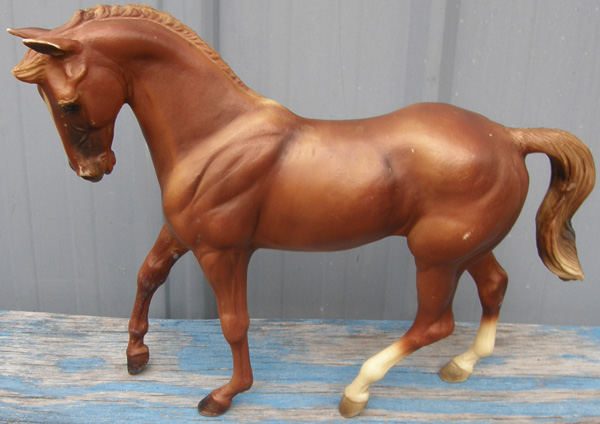 Chestnut done on the Secretariat mold done as a portrait model of the real race horse by the same name. Sculpted by Chris Hess. Made by Breyer 1987-1995 only.