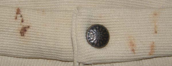 The Tailored Sportsman side zip style jodhpurs at a very affordable price. Waistband with belt loops, side zipper, 2 pockets, same fabric extended knee patches, & buttons inside cuffs with elastic pant straps. No fabric content tags but should be a lightweight nylon/poly/spandex(?) blend. Dry clean or machine washable. Not tagged as to size, it measures unstretched 29" at waist & has a 29 1/2" inseam. Excellent hardly used condition but does have a stain on front right thigh(see inset), a few tiny marks on outside of left leg & minor fabric pilling at bottom of legs from friction. Great for showing.
