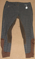 Front zip style breeches with wide elastic waistband with belt loops & snap, same fabric knee patches, & Velcro at ankles. 100% nylon. Not tagged as to size, but it measures unstretched 33" at waist & has a 24 1/2" inseam. Great for lessons, schooling, clinics, or every day wear with an English flair, etc.