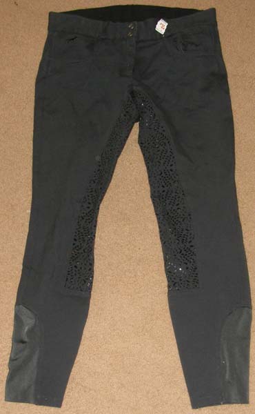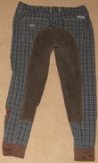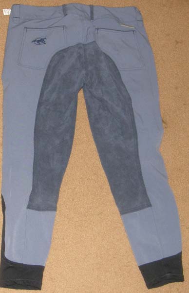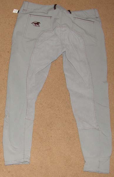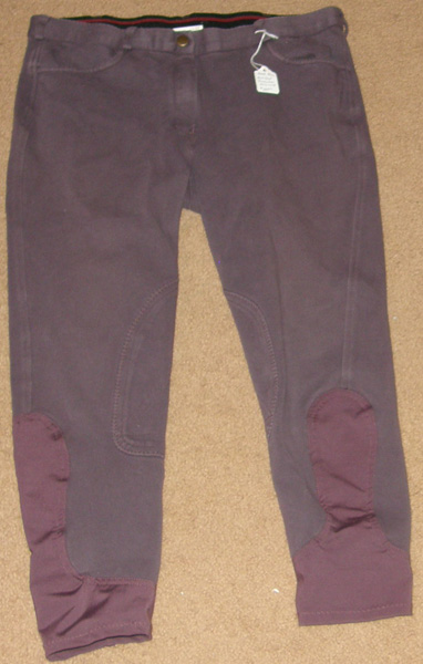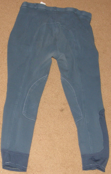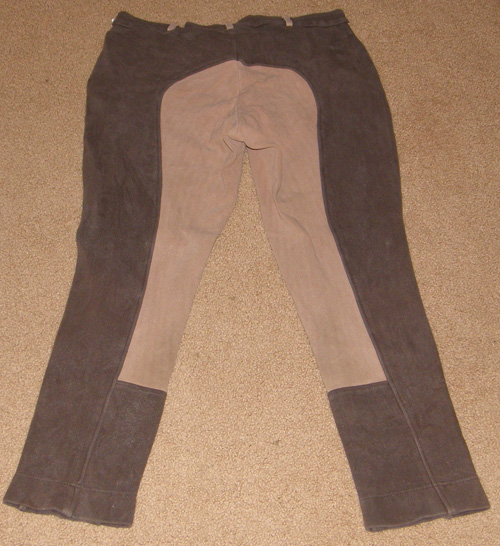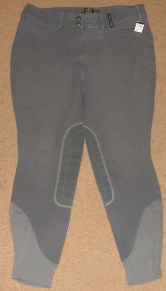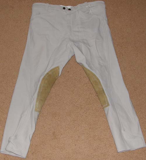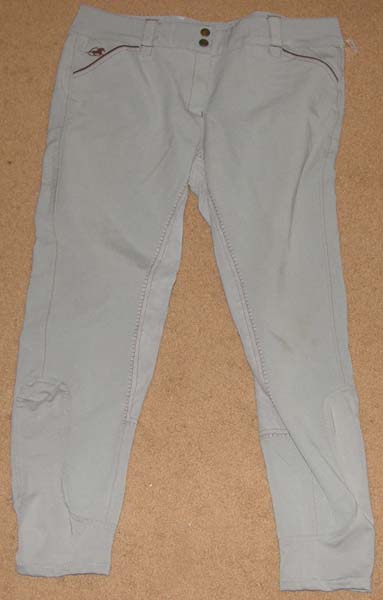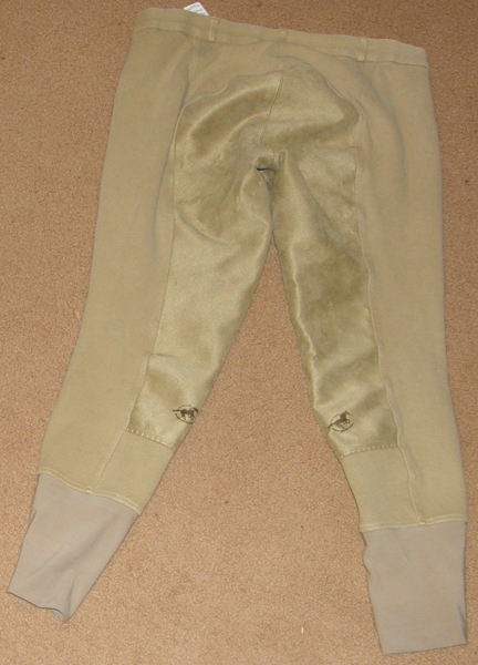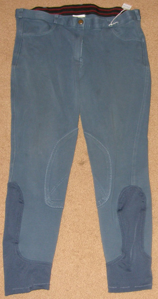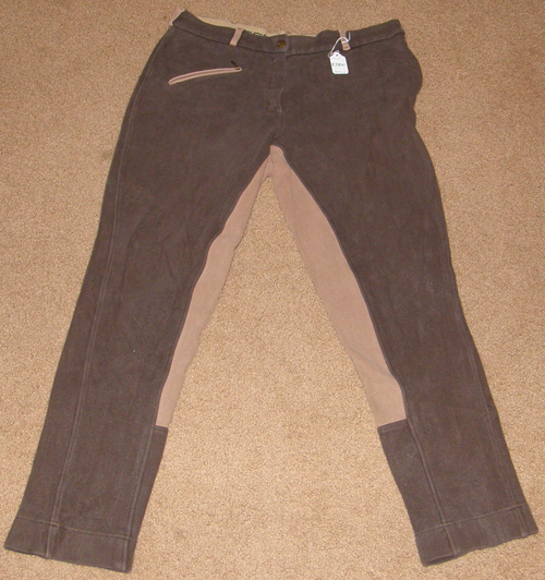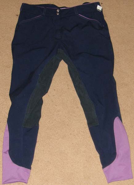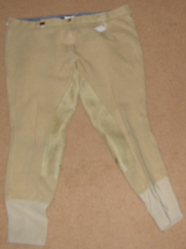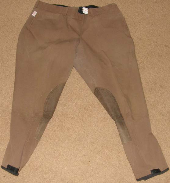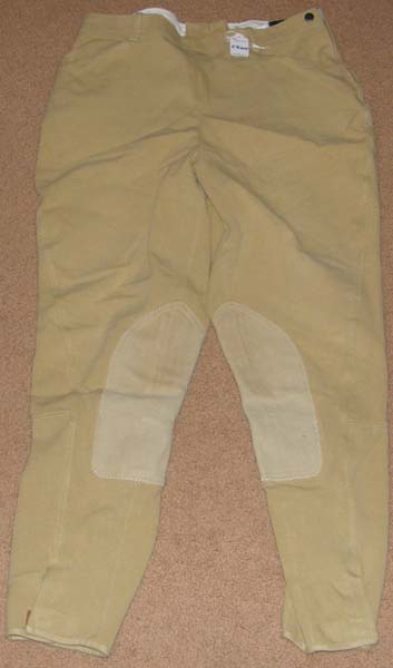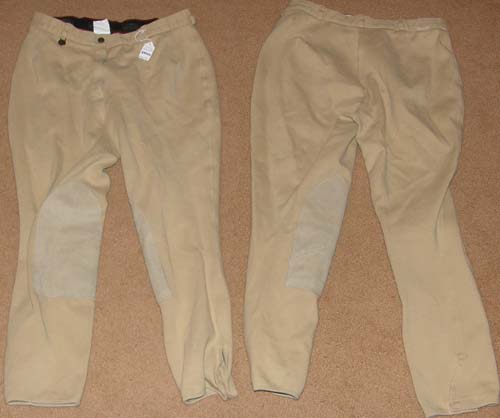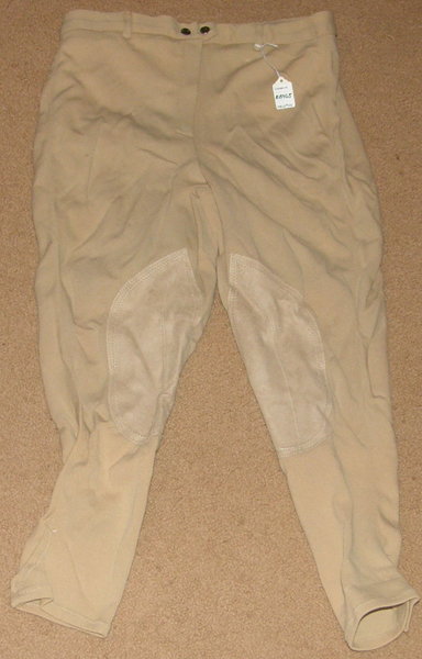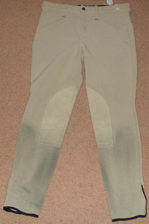 Front zip style breeches with no roll elastic lined waistband with belt loops, 2 front pockets, Clarino type knee patches, & velcro at ankles. 90% cotton/10% lycra. Tagged size 30 R(Ladies), it measures unstretched 32" at waist & has a 21 1/2" inseam. Stains on knee patches, otherwise excellent used condition.